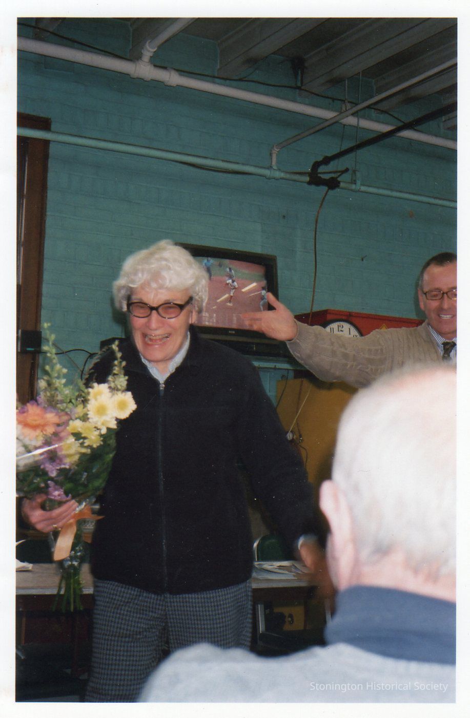 Color photograph of former Borough Burgess, Eleanor "Ellie" Casey (1924-2019), at her retirement party. Borough Warden Andrew Maynard is pictured in the background. Casey also served as Justice of the Peace.