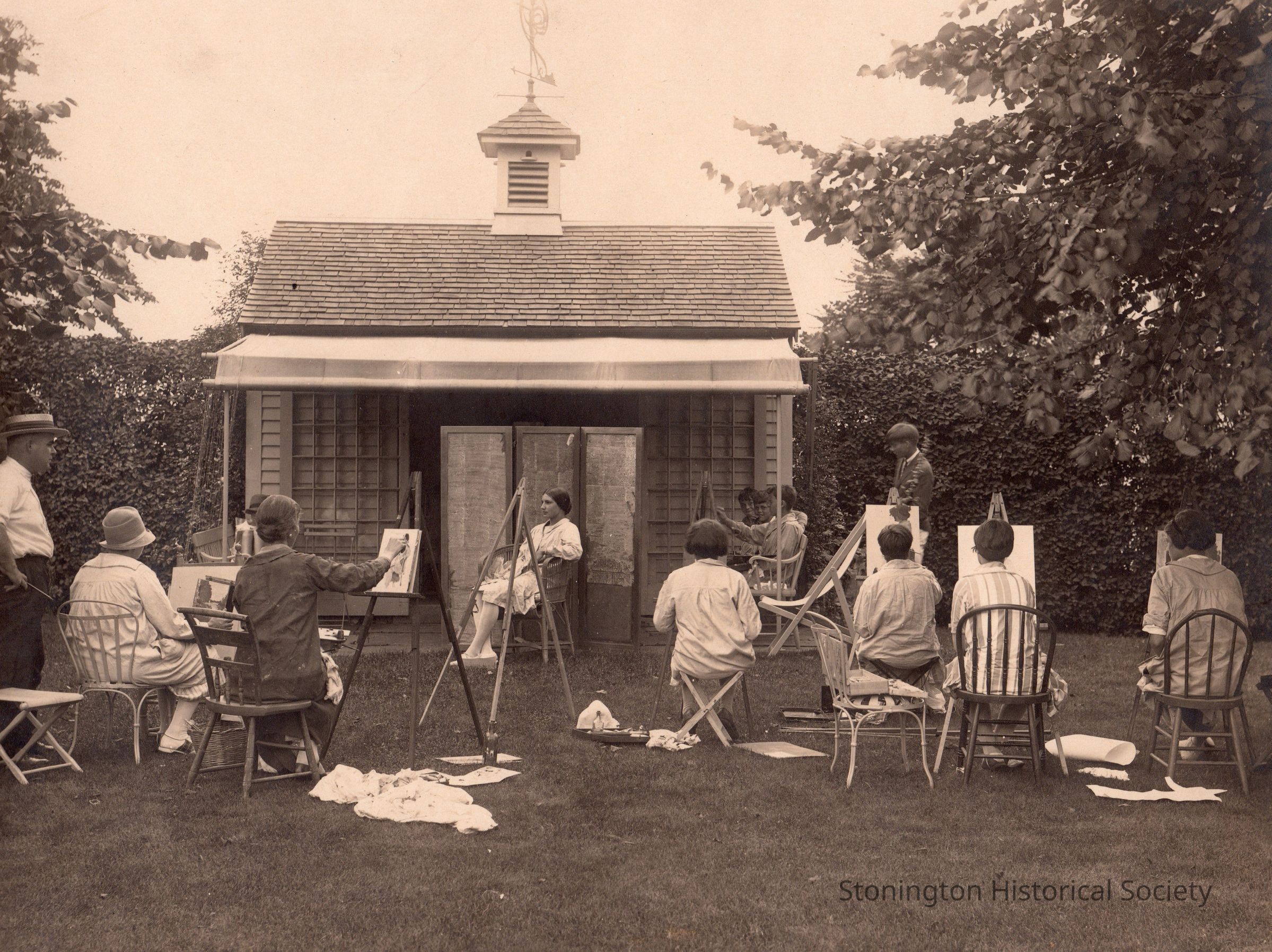 collection of photographs of local "Gentry" including copy prints, black and white photographs and cyanotypes (some mounted on board), depicting upper class stonington residents participating in leisure activies (hunting, tennis, sailing, dancing, parties) c. late 1800s-early 1900s (1885-1928)
