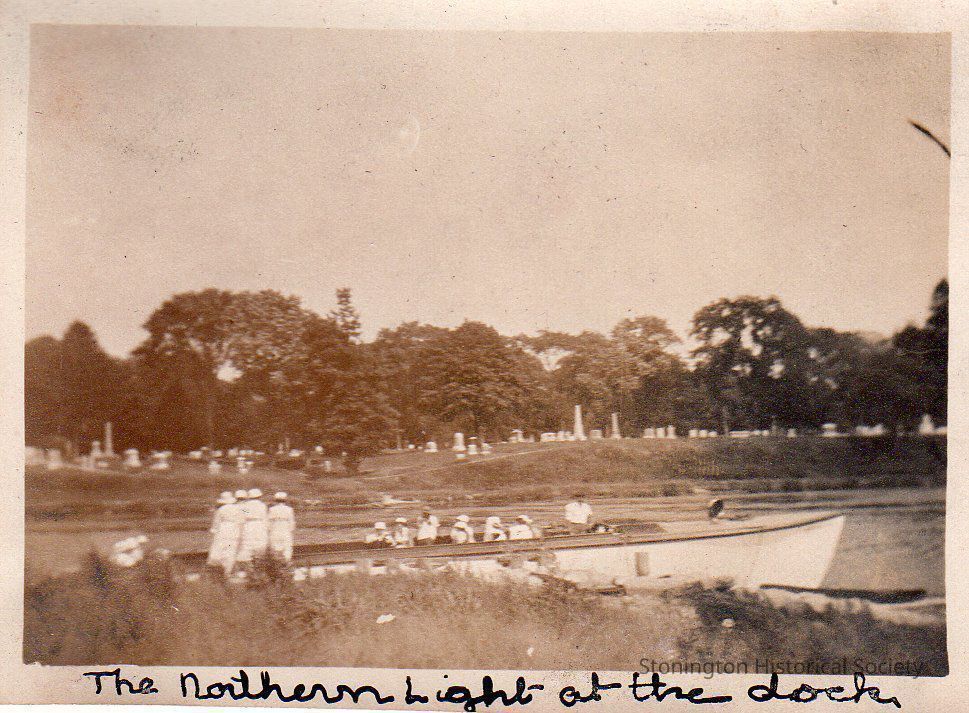 black and white snapshot, "The Northern Light at the dock," Elm Grove Cemetery pictured across the river from Camp Mystic, August 1918, taken from the Helen Streeter Photograph Album, 1918.Collection
