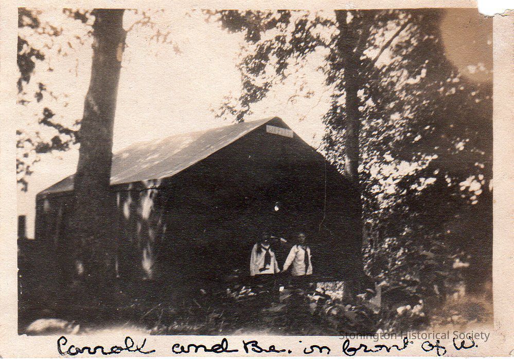 black and white snapshot, "Carroll and Be. in front of W." [Wapiti tent] at Camp Mystic, August 1918, taken from the Helen Streeter Photograph Album, 1918.Collection