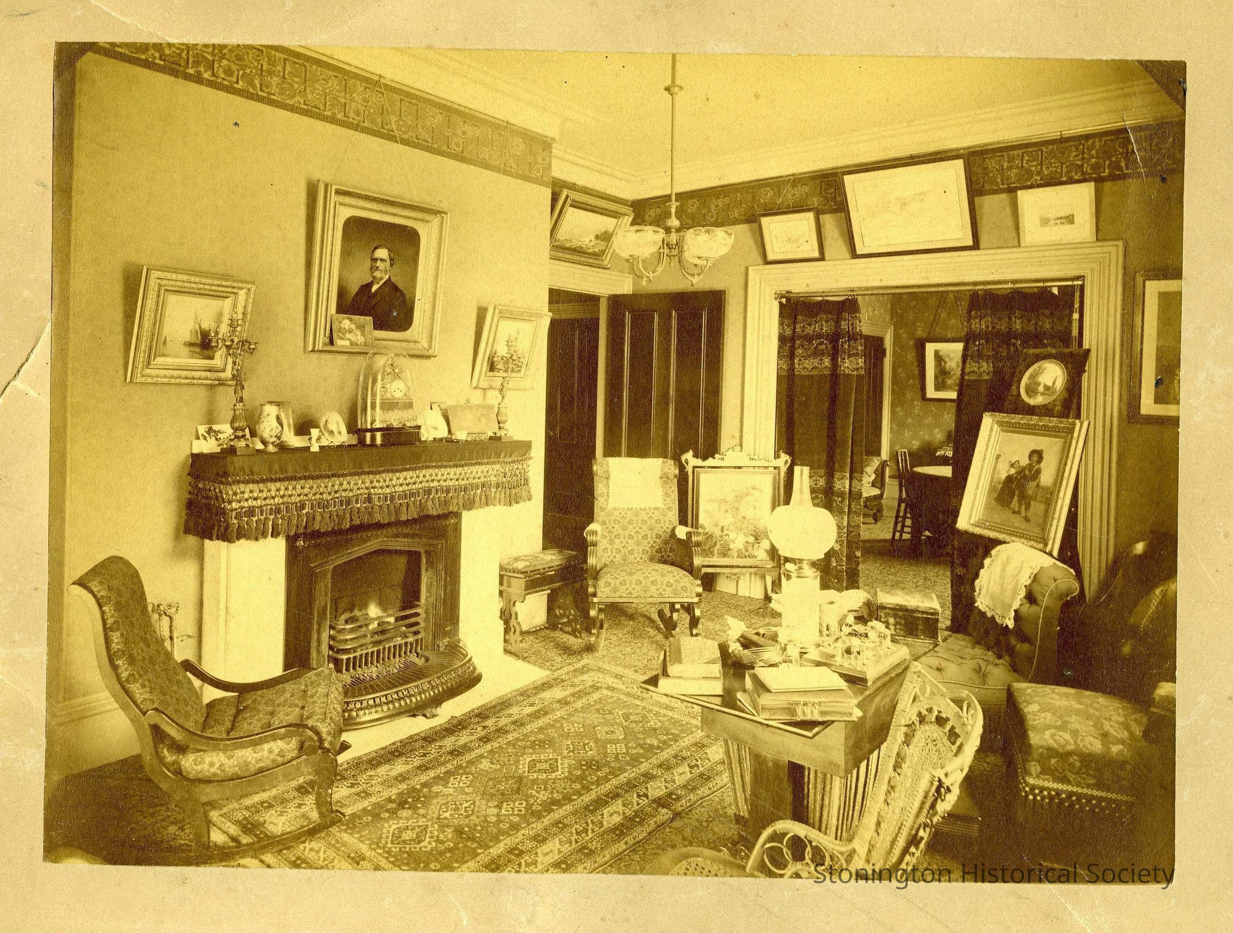 A large photograph of an unidentified interior. Wynne Delmhorst who grew up at Stone Acres farm, has said this is not Stone Acres and believes it could be the Adams family home in Massachusetts. The photograph shows an ornately furnished room with a number of paintings and heavy velvet fabrics.Collection