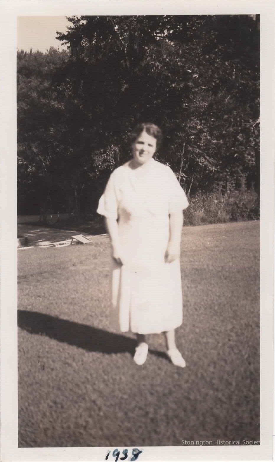 black and white photograph Edith Kirk at the Shawondasee Estate, 1938 (aged 43 years). Edith's husband, Wilson Kirk, was cartetaker of the estate.