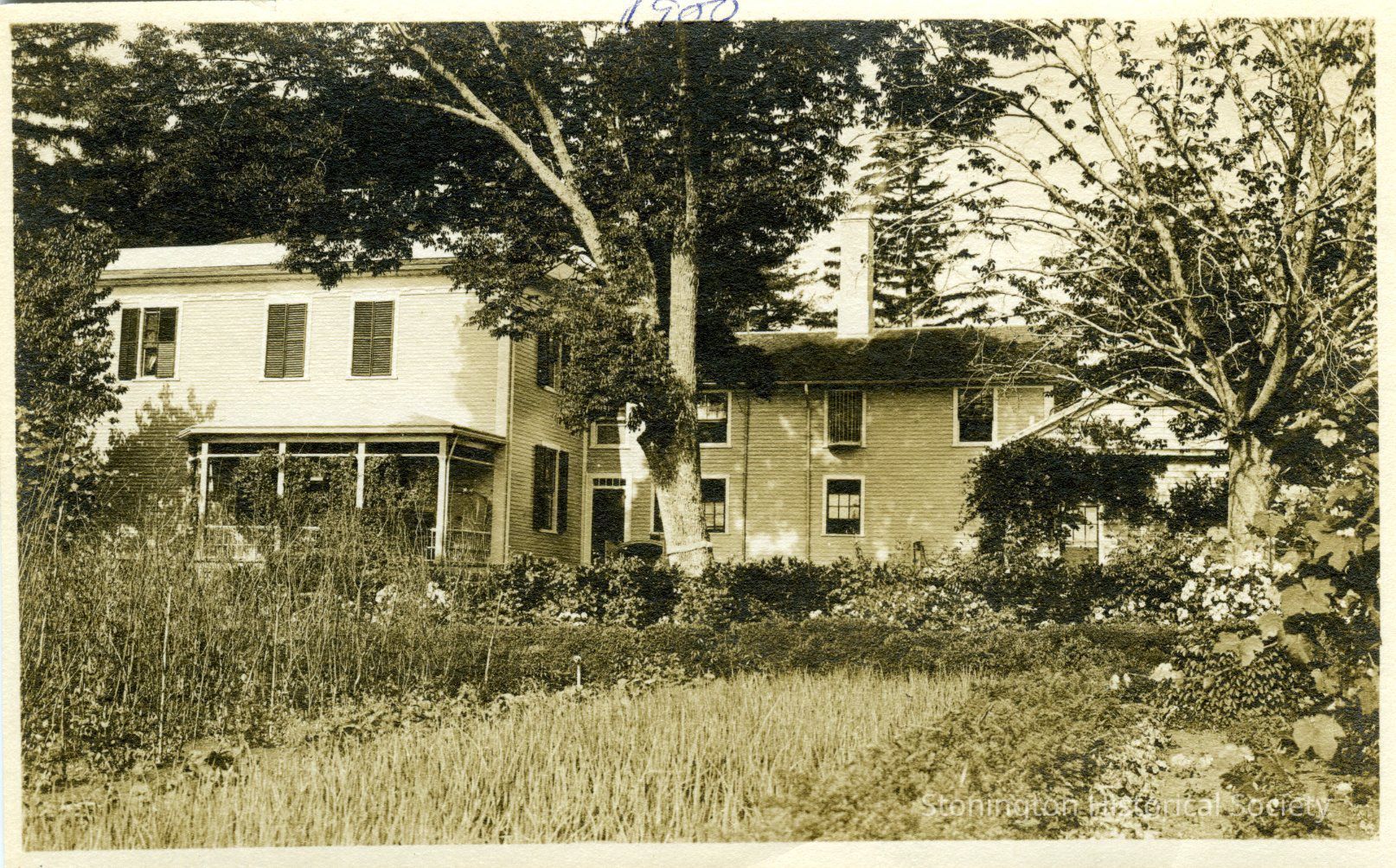 Photograph of the exterior of the main house at Stone Acres, c. 1900. This view shows the original porch before the new porch and 2nd floor balcony were added on in 1922.Collection