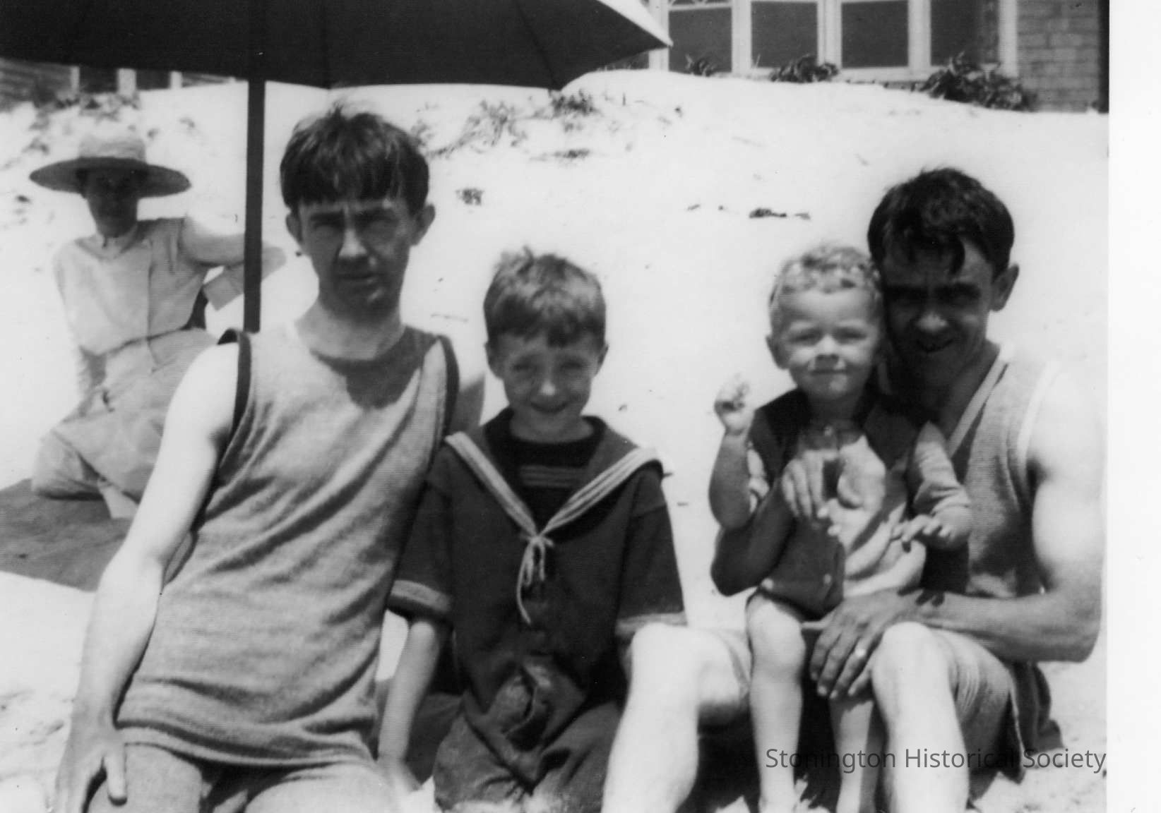 Group photograph on beach. Left to right: Libby Fitch Anderson in the background, Arthur, Robert, Doug and Charles. Negative is included behind picture.