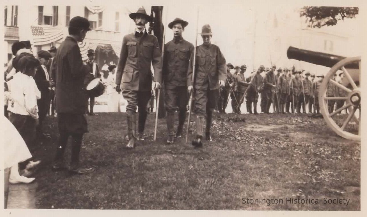 Photograph, Scoutmaster James H. Stivers, Louis Demaura, Maurice Powers at Cannon Square, photographed August 1914 for the Battle of Stonington Centennial.