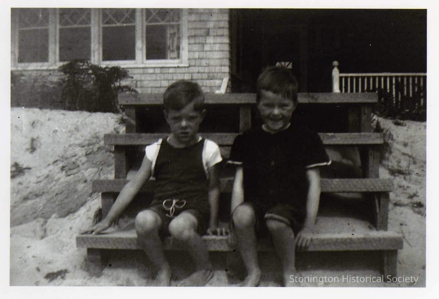 Robert P. Anderson on left, sitting on the steps of a family beach house. Unidentified boy is beside him. There are two copies of this photograph.