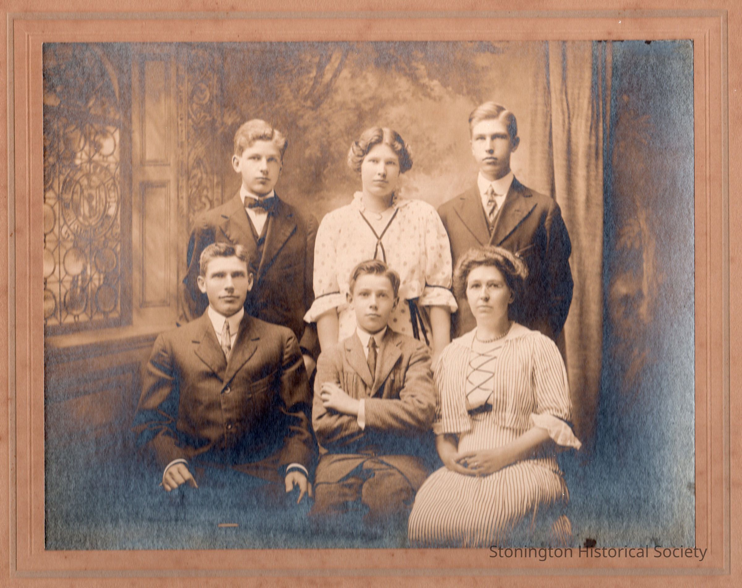 Photograph portrait of the Ryon family, mounted on board, taken by George Tingley, Mystic Conn, September 17, 1915.