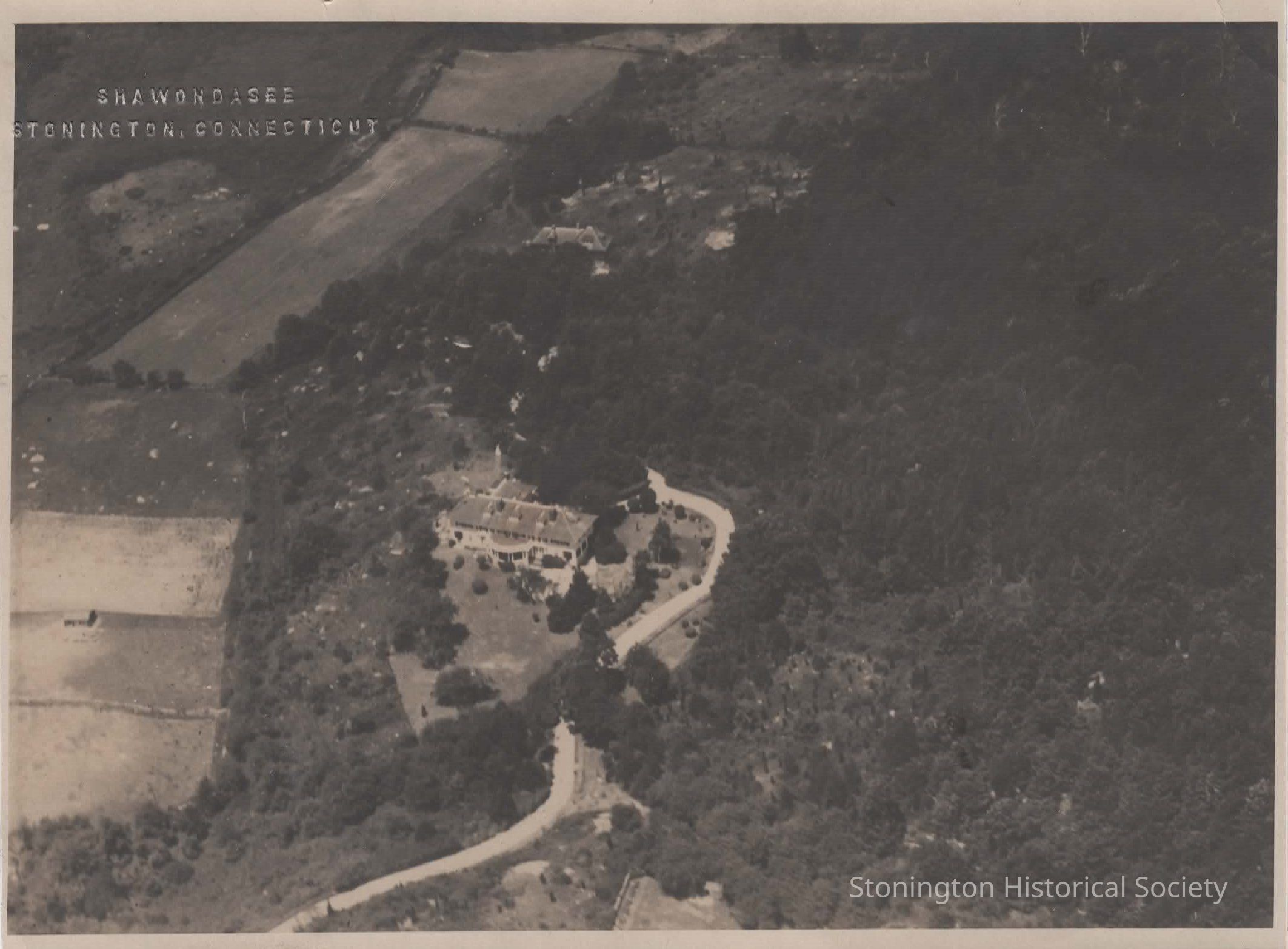 black and white aerial photograph of the Shawondasee Estate, a summer residence built by sisters Margaret and Mary Dreier off Flanders Road in Stonington in 1904.