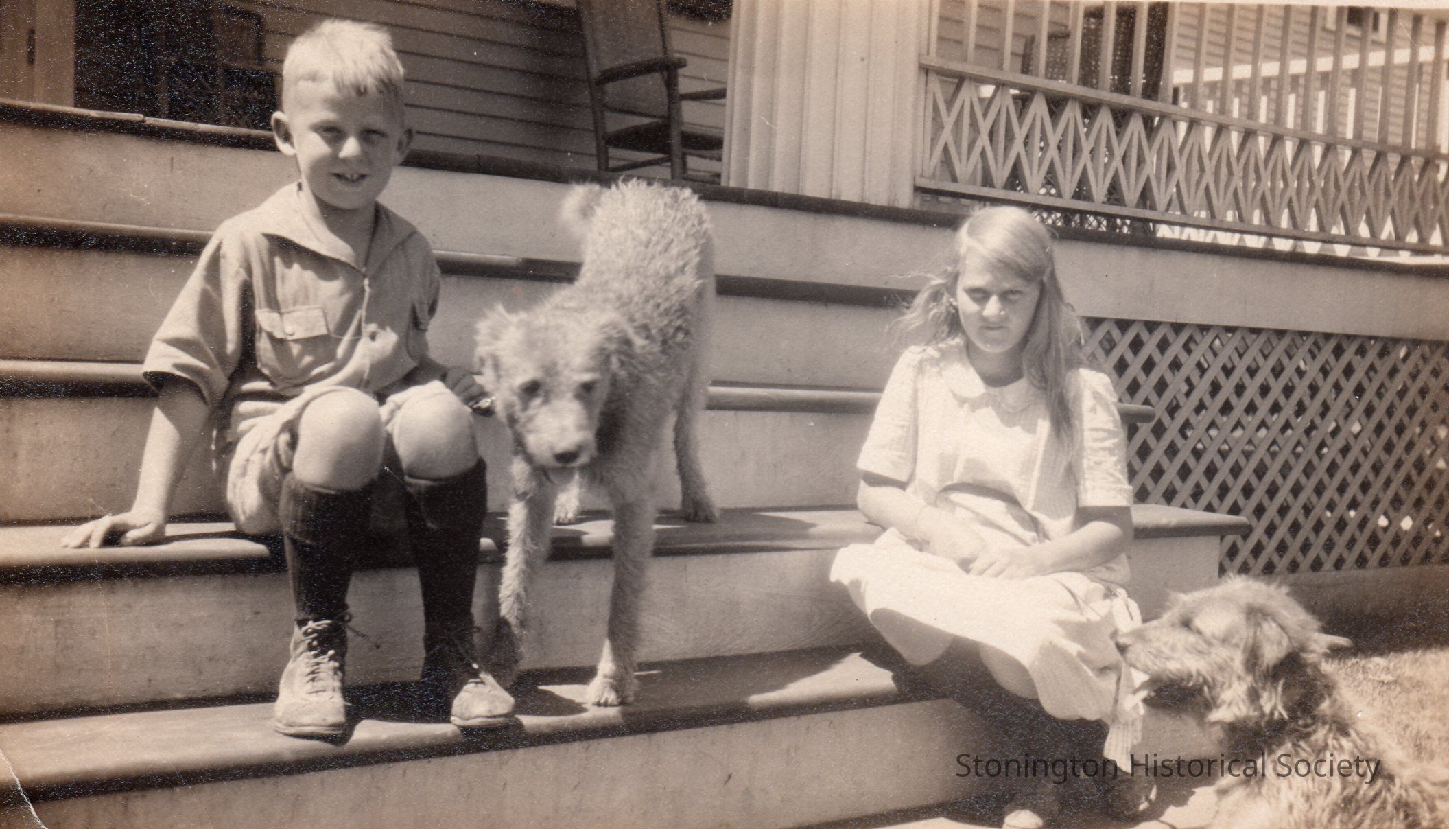 black and white photograph, Frederic Jr. "Freddy" and Jane Paffard with their dogs Watch and Roy on the east porch steps at Stone Acres, 1923
