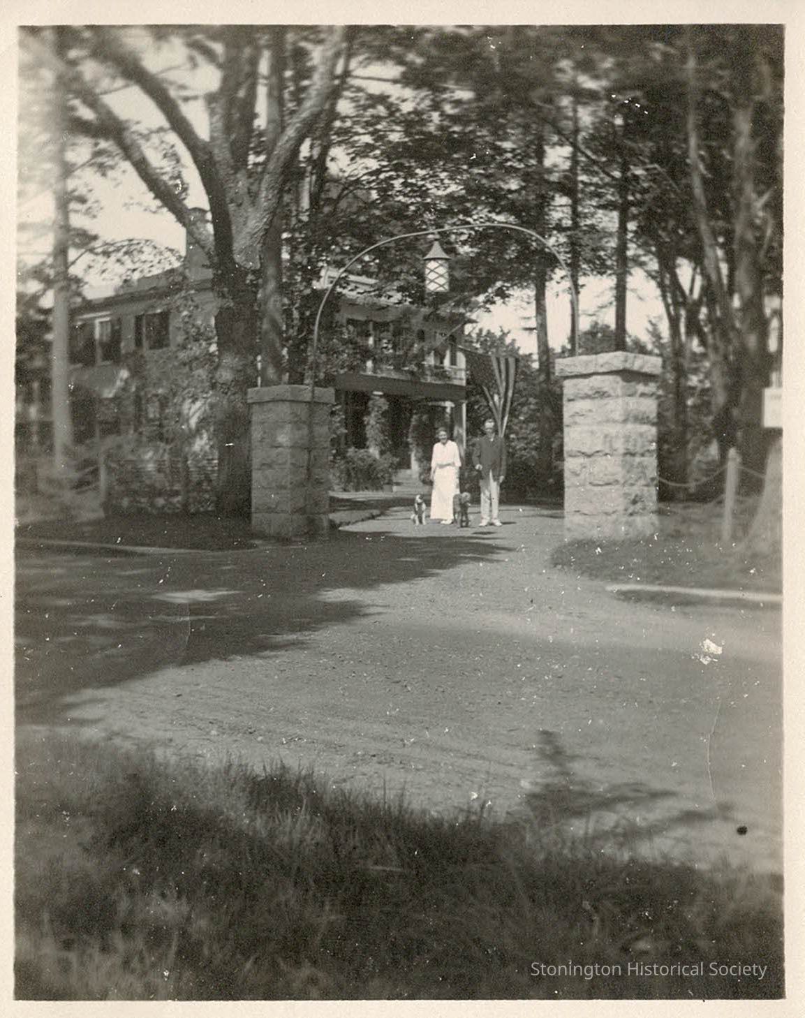 Photograph taken from North Main Street across from the entrance to Stone Acres. Eugene Edwards and his wife Eliza Kendall Adams (Lila) are standing in the driveway with two dogs. Note the stone columns and arch with the hanging lantern. Back of the photograph reads "1914."Collection