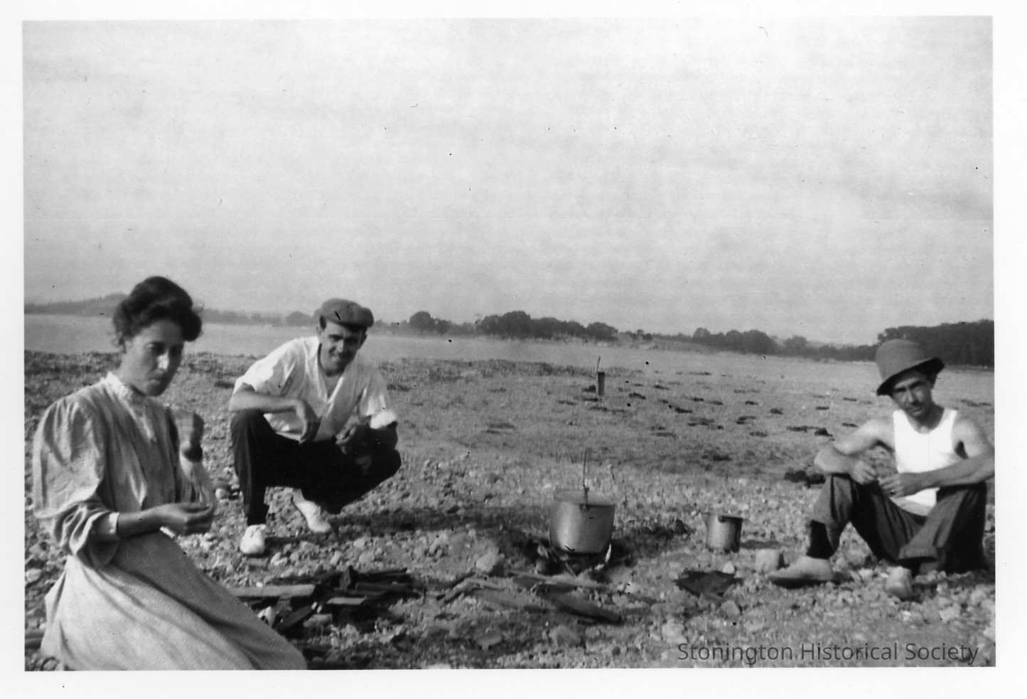 Libby, Charles and Arthur Anderson having a small camp picnic on the beach. Back of the photo reads: "Bibby, Carl and Arthur" but this may have been misidentified.