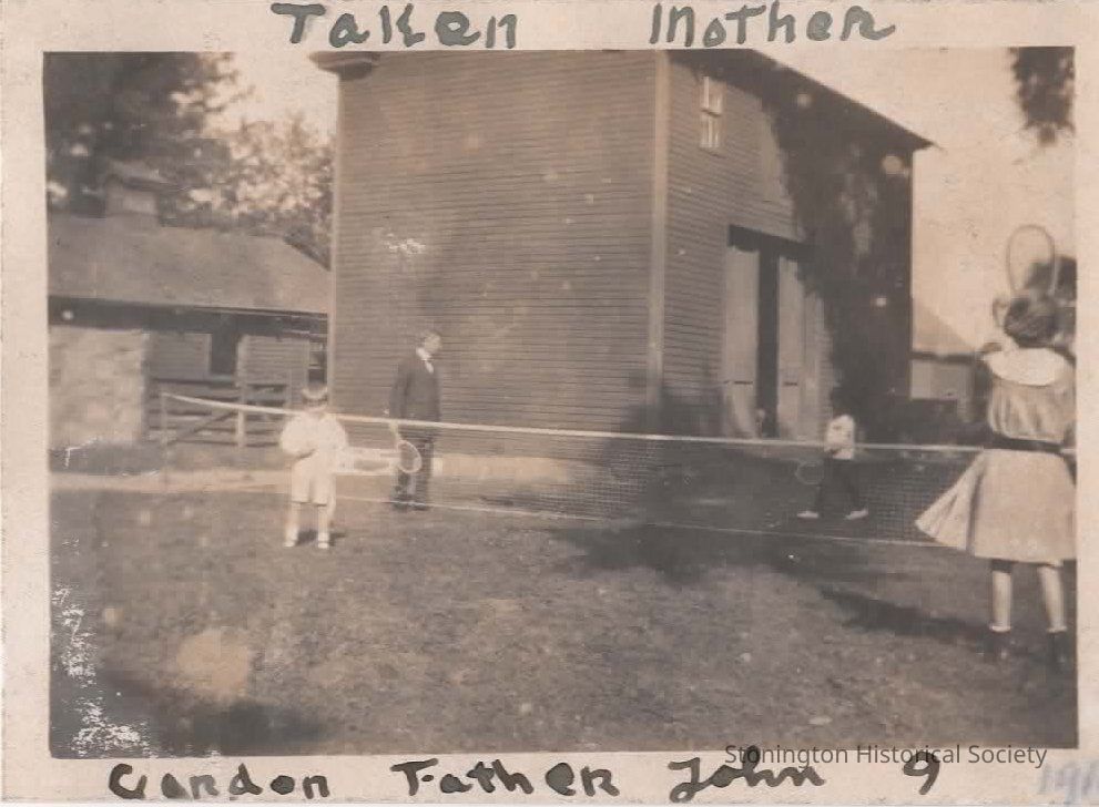 black and white snapshot "Gordon, Father, John, Helen, Taken by Mother, 1916," taken from the Helen Streeter Photograph Album, 1916Collection
