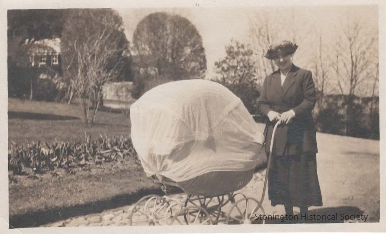 black and white photograph of Edith Kirk at the Shawondasee Estate, c. 1921. Edith's husband, Wilson Kirk, was the caretaker for the estate.
