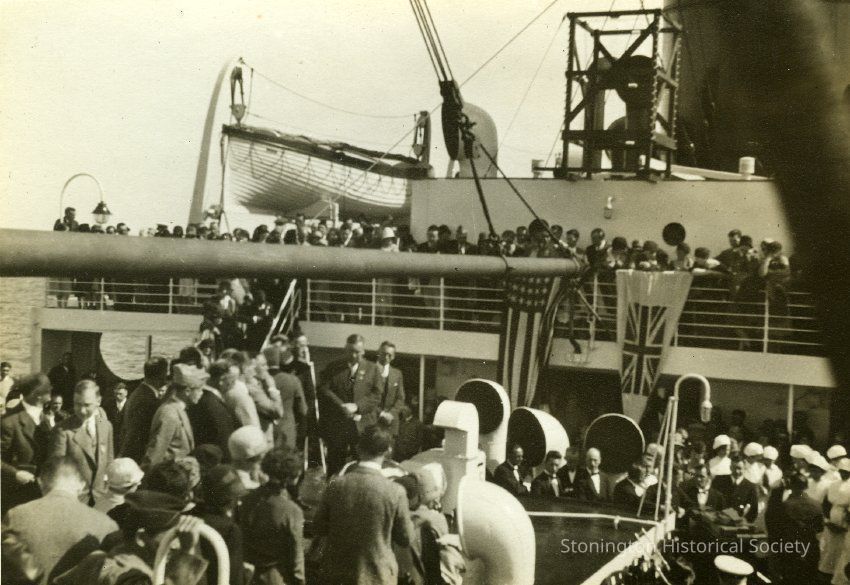 black and white photograph, celebration with band and civilians on deck unknown vessel