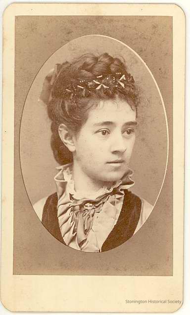 Head in oval photo of girl (late teens) in silk ruffled shirt, braided hairdo with decorated band
