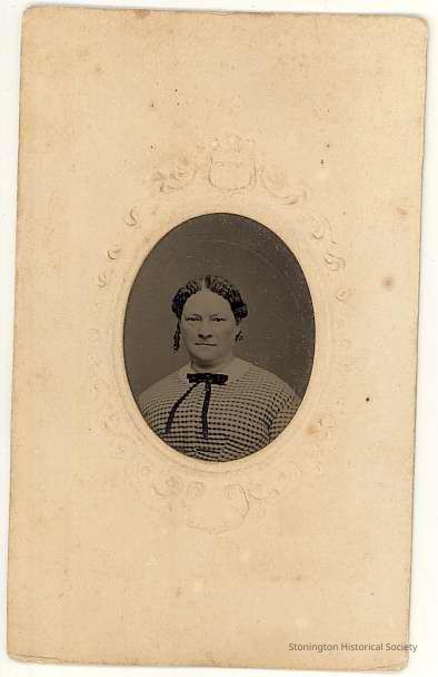 2 x 1 3/4 tintype in oval embossed mat 4 x 2 1/2 CDV head and shoulders of Nancy Noyes Steward wearing cheked dress with white collar and black velvet ribbon. Tinted cheeksCollection