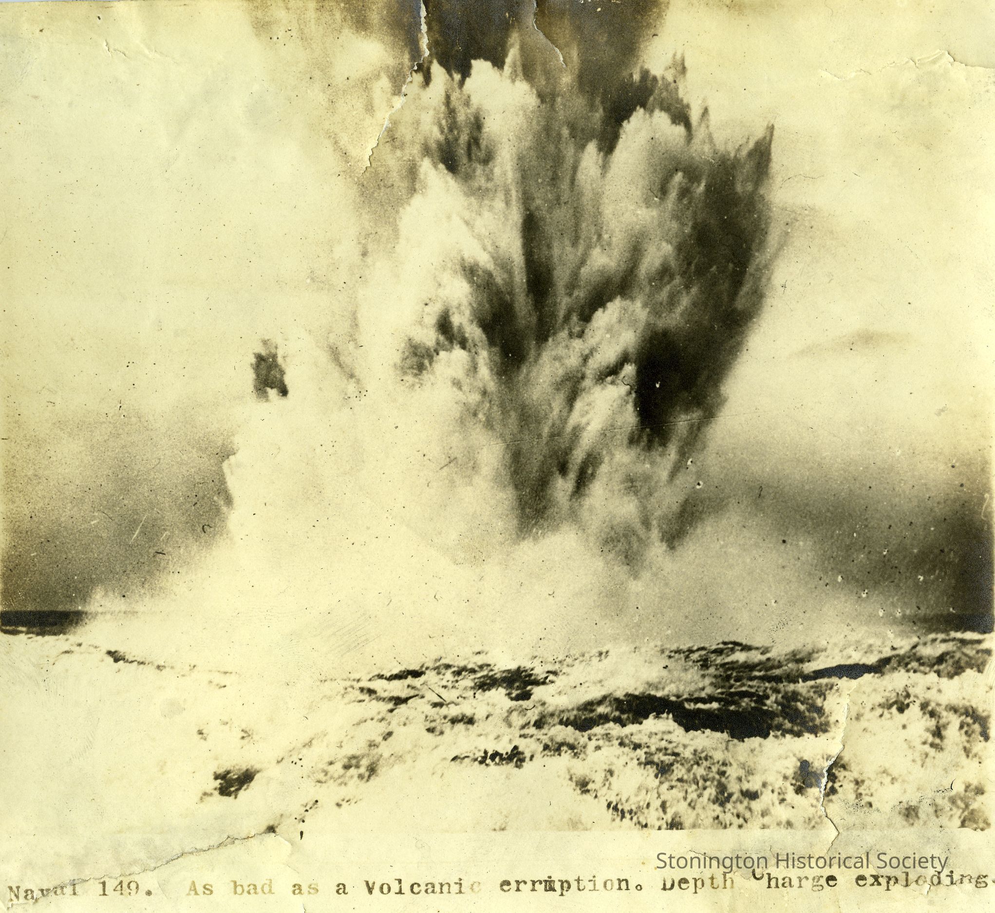 black and white photograph, explosion of a depth bomb at sea, captioned: "Naval 149. As bad as a volcanic eruption. Depth Charge exploding.Collection