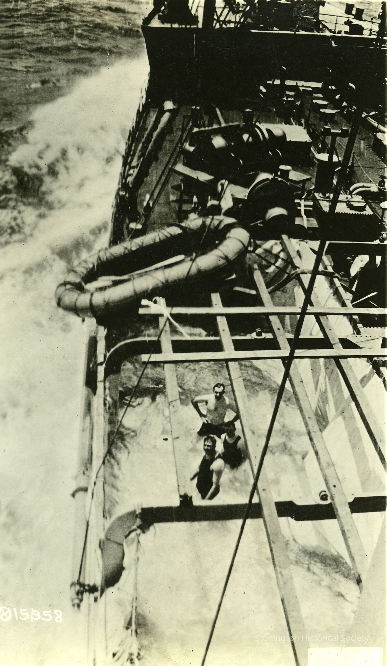 black and white photograph, crew members on deck (in pool?) of unknown vessel, stamped "U.S. Official"