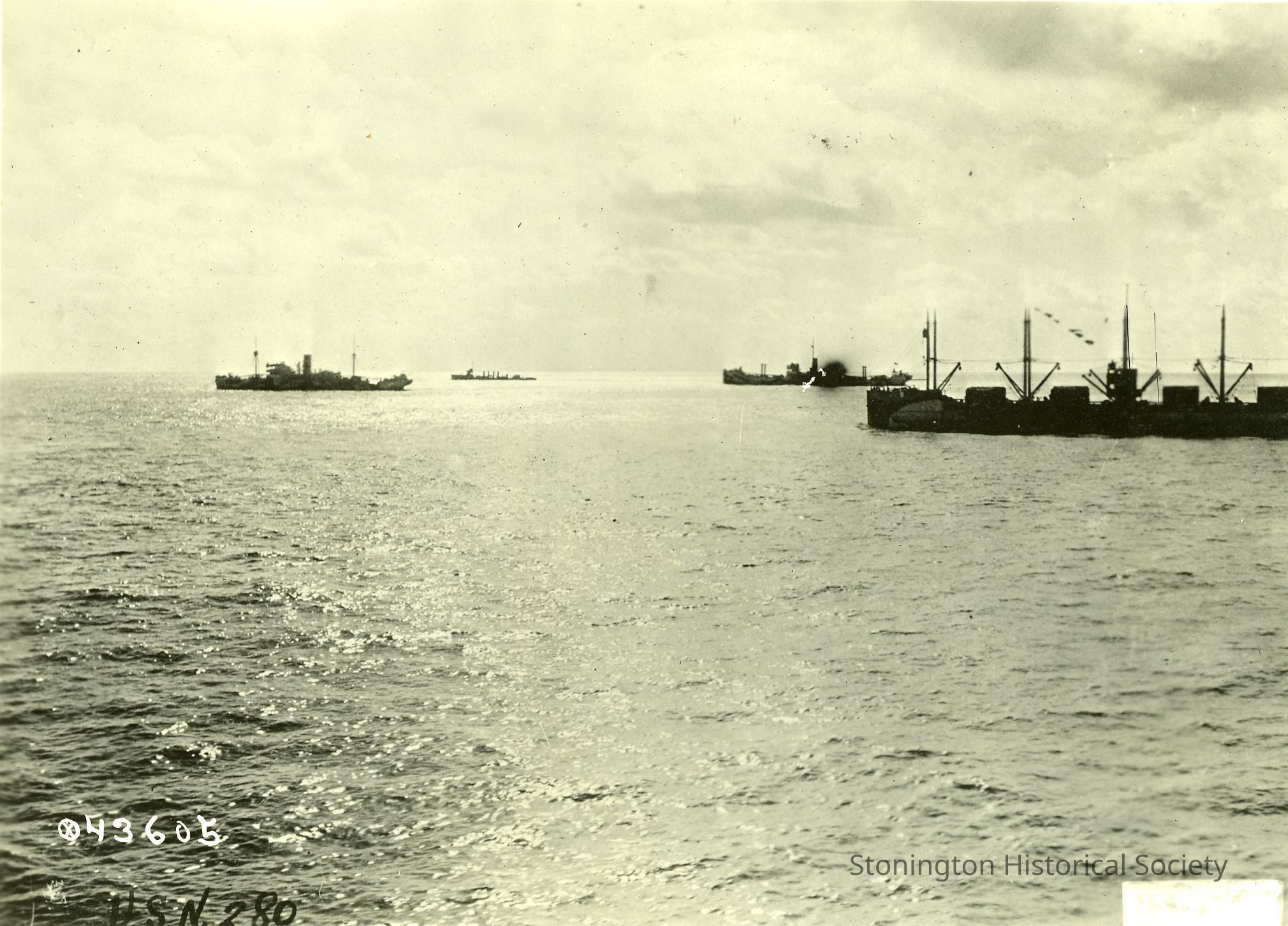 black and white/sepia photograph, crew members on deck of unknown vessels, stamped "USN 280, U.S. Official"