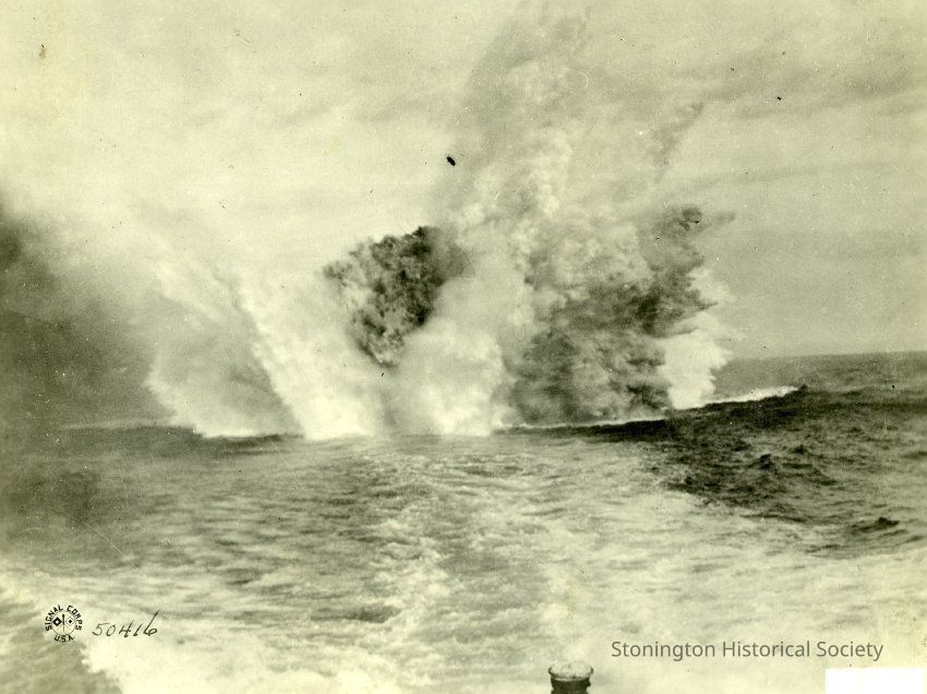 black and white photograph, explosion of a depth charge at sea, stamped "U.S. Official, Signal Corps, USA"