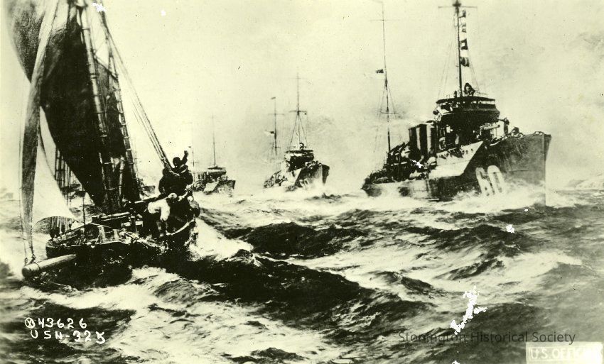 black and white photograph, three steamers and ship, stamped "U.S. Official"