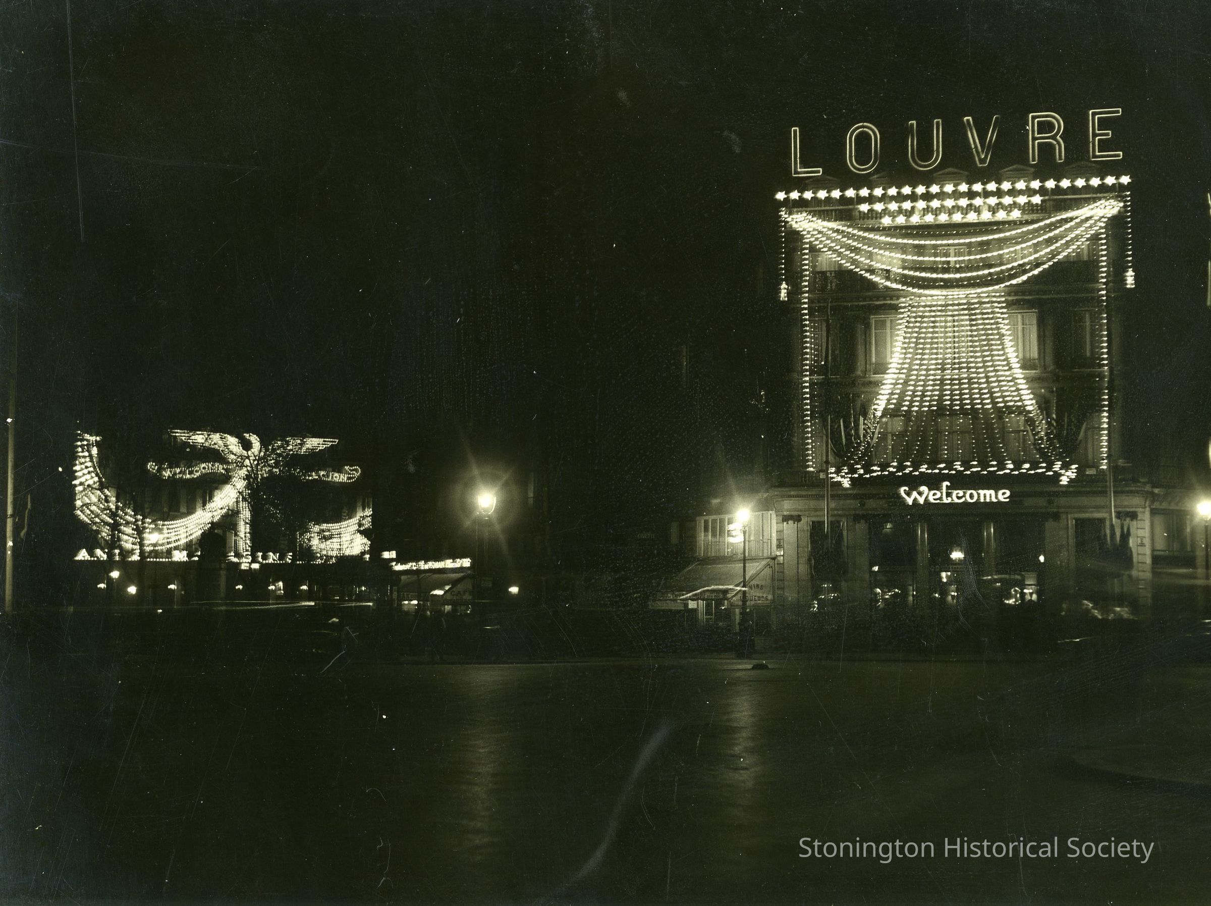 black and white photograph, the Louvre at night