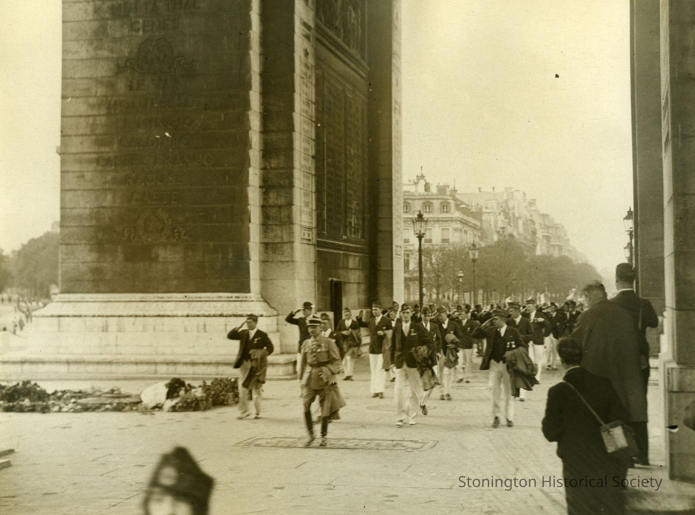 black and white photograph, celebrations at the Arc de Triomphe, with soldiers marching in military formation