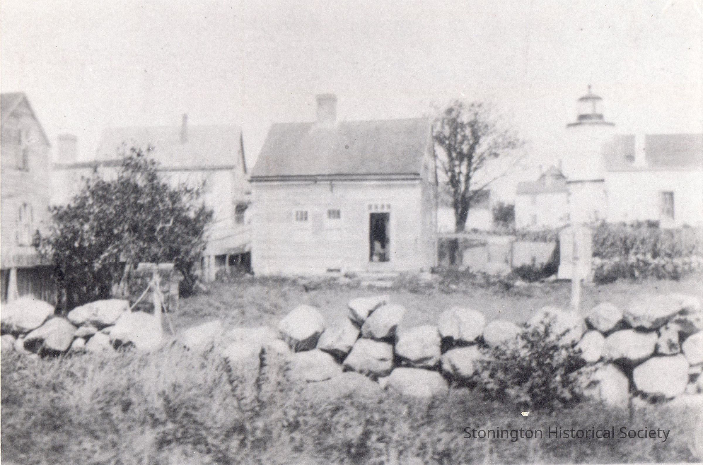 Black and white snapshot, view of the old lighthouse and Water Street at the point of Stonington Borough.