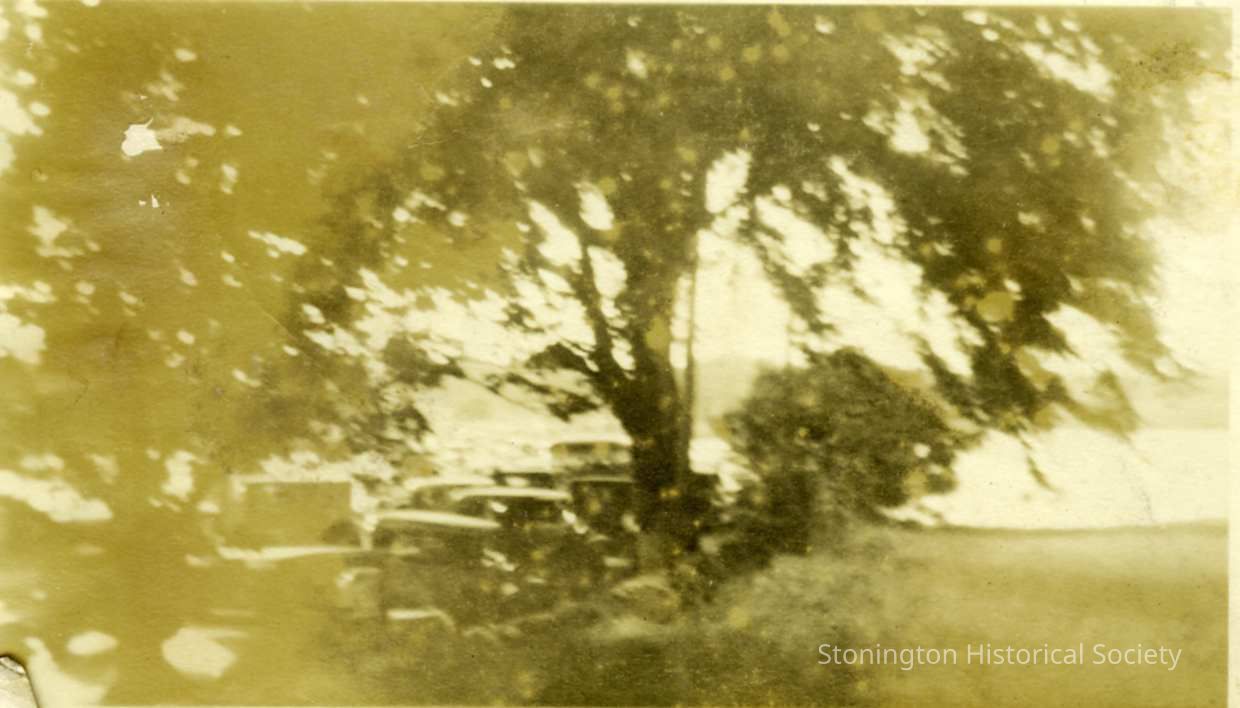 A blurry, sepia toned photograph showing a number of early-style cars parked beneath a tree and along a dock. Probably taken in front of the Palmer House here, or at Don's Dock.Collection