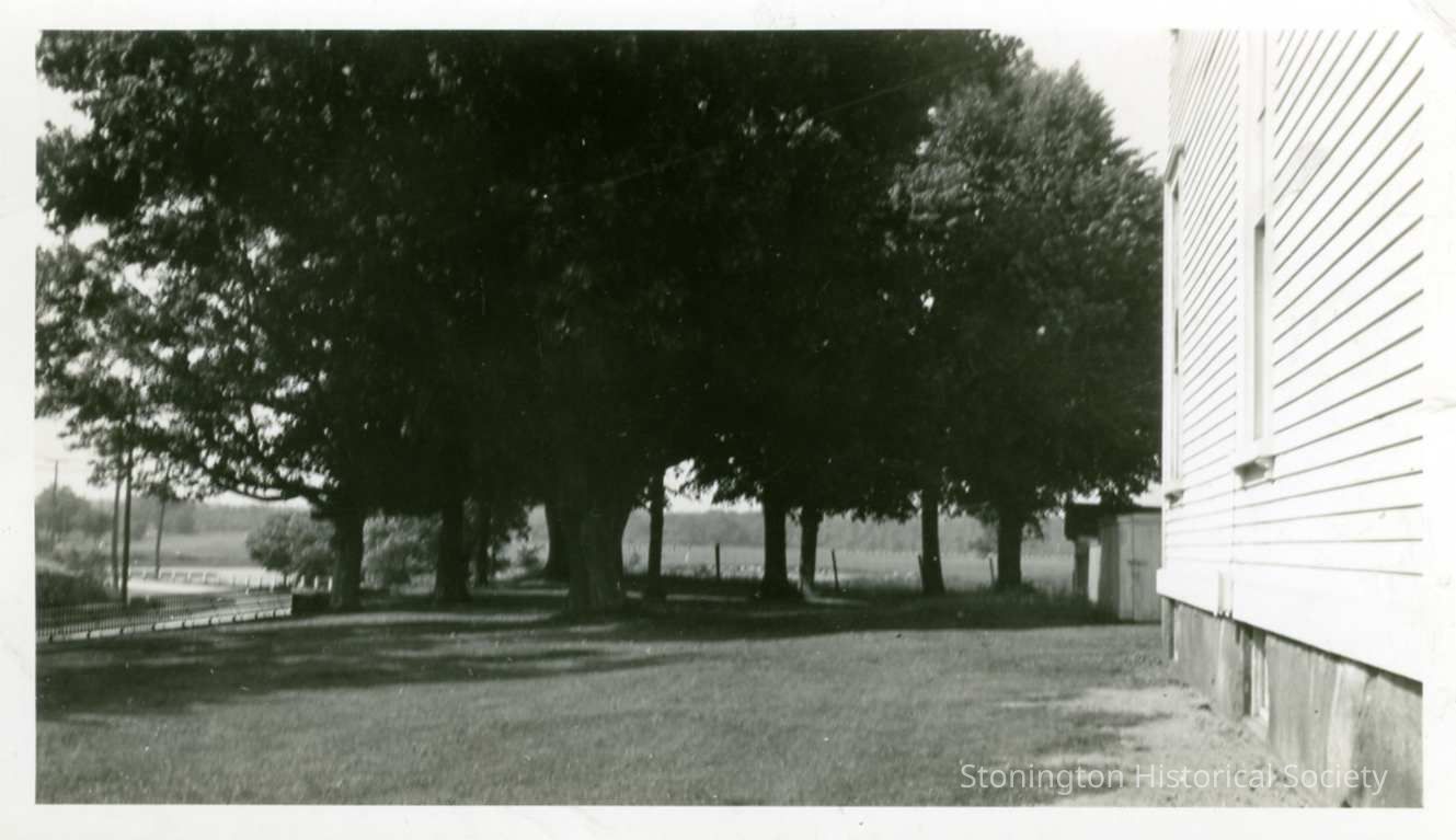 A small, black and white photograph of the west lawn of the Captain Nathaniel Palmer hosue. The railroad bridge is visible on the left, and the edge of some farm buildings (barn and or chicken coop) are visible on the right.Collection