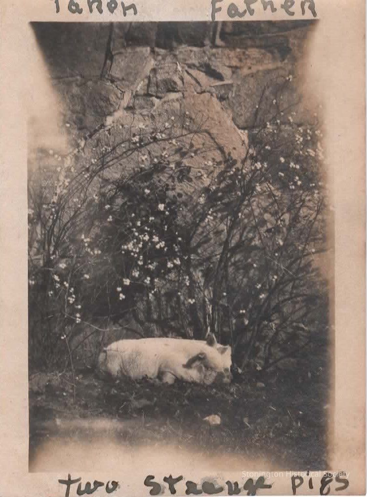 black and white snapshot "Two strange pigs, taken by Father," taken from the Helen Streeter Photograph Album, 1916Collection