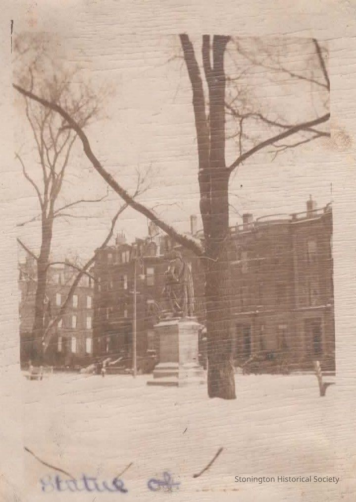 black and white snapshot, statue in Boston Commonwealth, taken from the Helen Streeter Photograph Album, 1916-1917.Collection