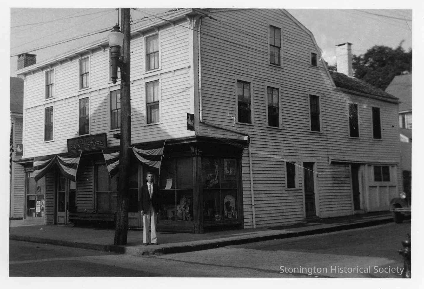 Stonington village in the 1930s. Potter's Paint Store with man standing on the corner. Negative included behind picture.