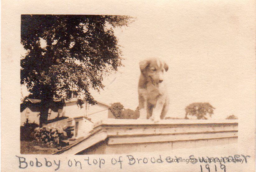 black and white snapshot, "Bobby on top of Brooder, Summer 1919" at the Streeter family home Red Brook, taken from the Helen Streeter Photograph Album, 1919.Collection