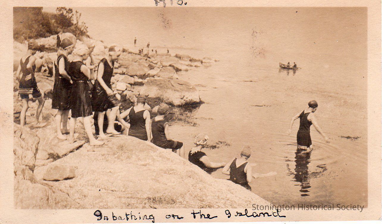 black and white snapshot, "Bathing on the Island," at Ram Island (also known as Mystic Island) at Camp Mystic, August 1918, taken from the Helen Streeter Photograph Album, 1918.Collection