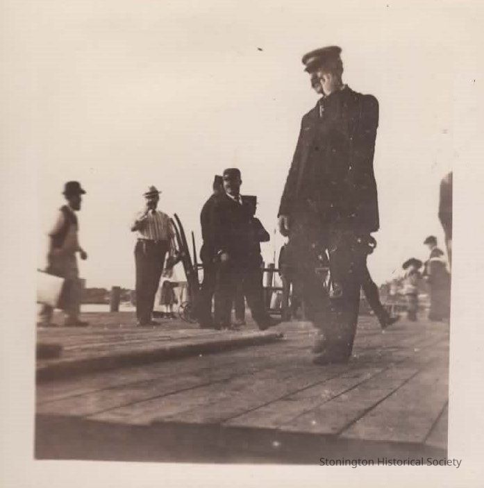 Black and white snapshot, men in uniform and pedestrians on a dock, one identified "Amos Lamphear." Late 1800s.