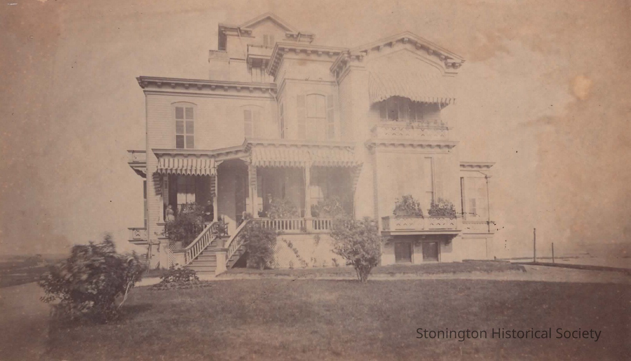 Photograph, "House of Eugene Atwood on Church Street before renovation. Mrs. Atwood stands at extreme left and Mr. Atwood at right."