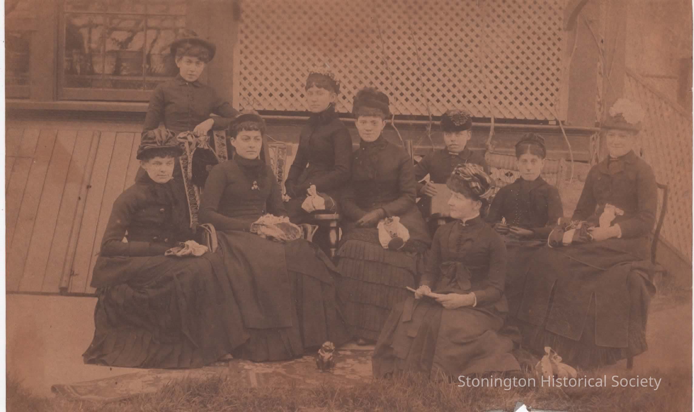 Photograph, "Barbara Muller, Luella (Tracy) Gager (standing in rear), Kate (Heydecker) Hahn, Jennie Barker, Lizzie Hamilton, Mary Muller, Cara (Slade) Bennett (sittingon ground), Belle Morey, Jennie Allen (daughter of Capt. Ray Allen, in whose yard on Main Street the picture was taken (owned in 1939 by Everett N. Pendleton." Q.D.C. Club.