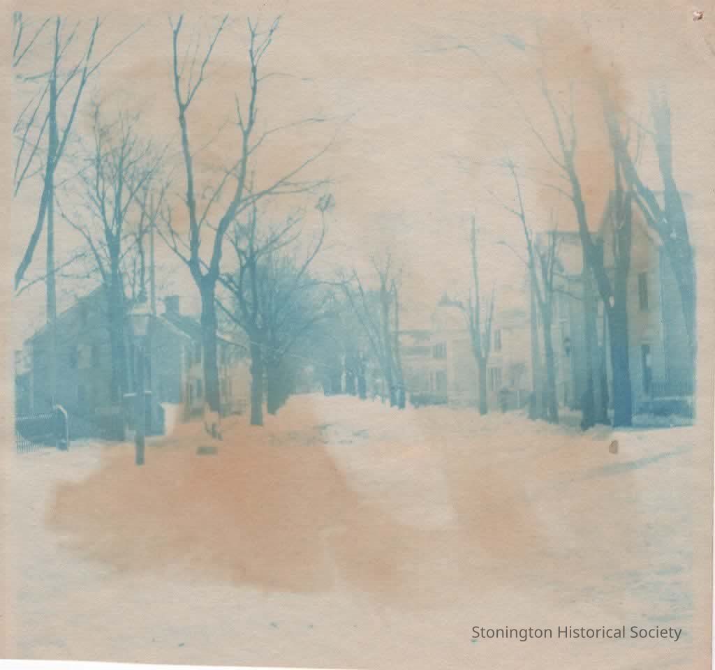 Cyanotype, "Main Street, showing snow piled on side of railroad track to permit passage of trains."