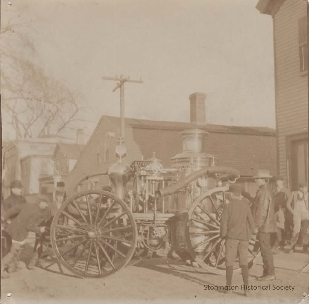 Photograph, "Backing Stonington steam fire engine into quarters, corner Gold and Grand Streets. Jerome S. Anderson, Jr., with derby hat, at left."