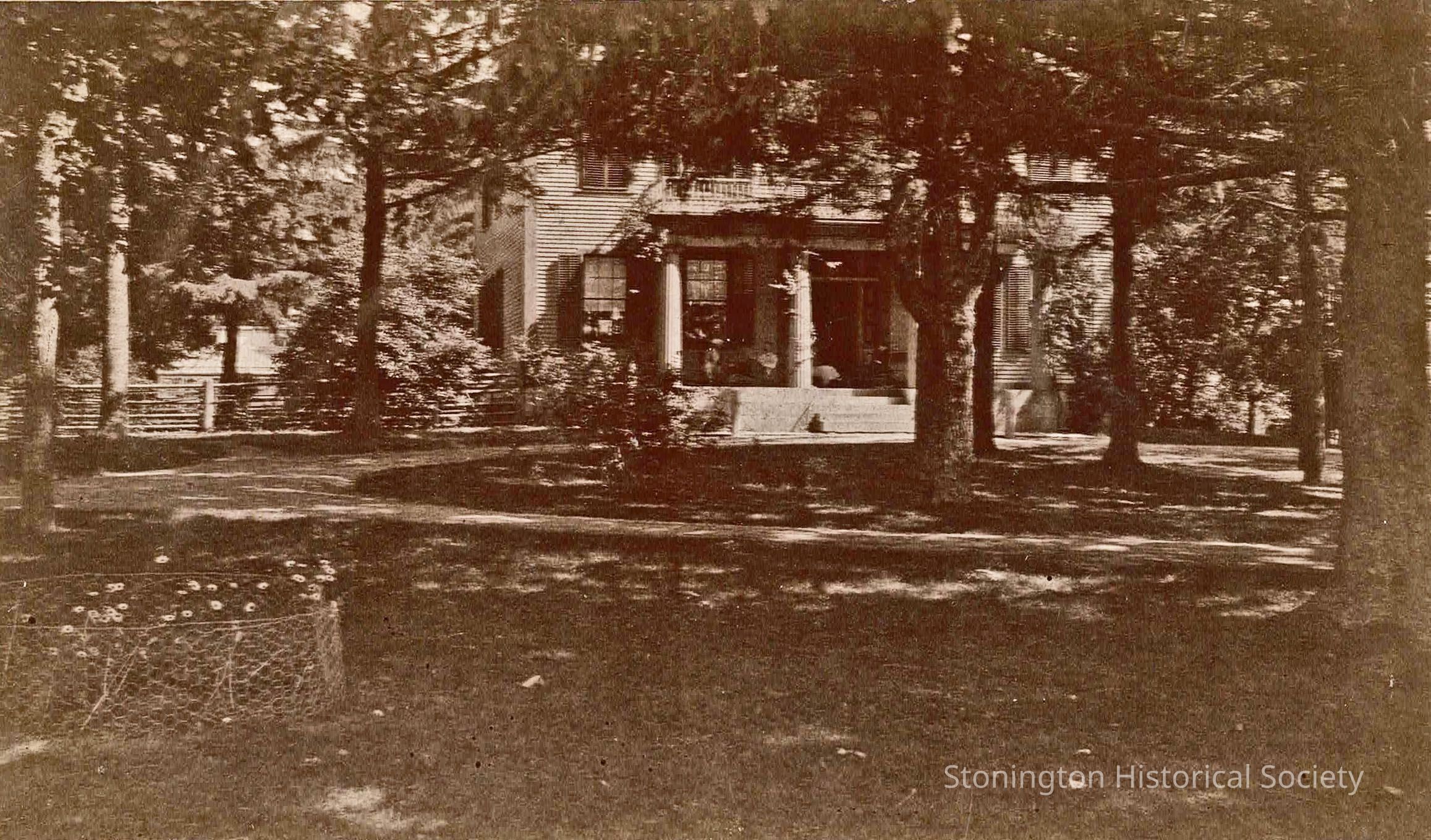 A view of the front entrance of Stone Acres, taken in 1900. There appears to be a woman in a white dress sitting on the front porch. Also note the flowers in the left foreground.Collection