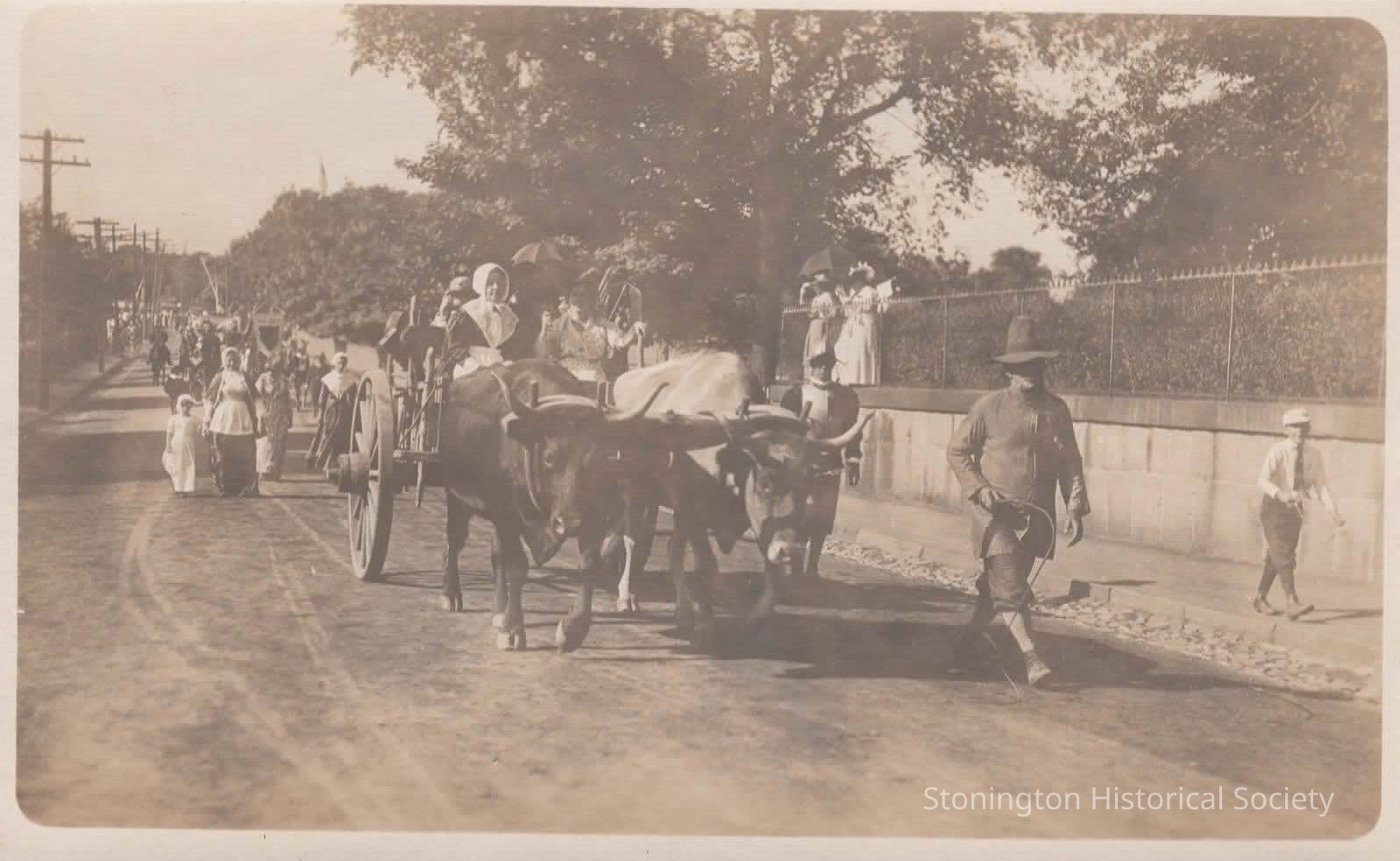 Photograph, printed on a postcard, of the Miner family marching in the Battle of Stonington Centennial parade, August 1914.