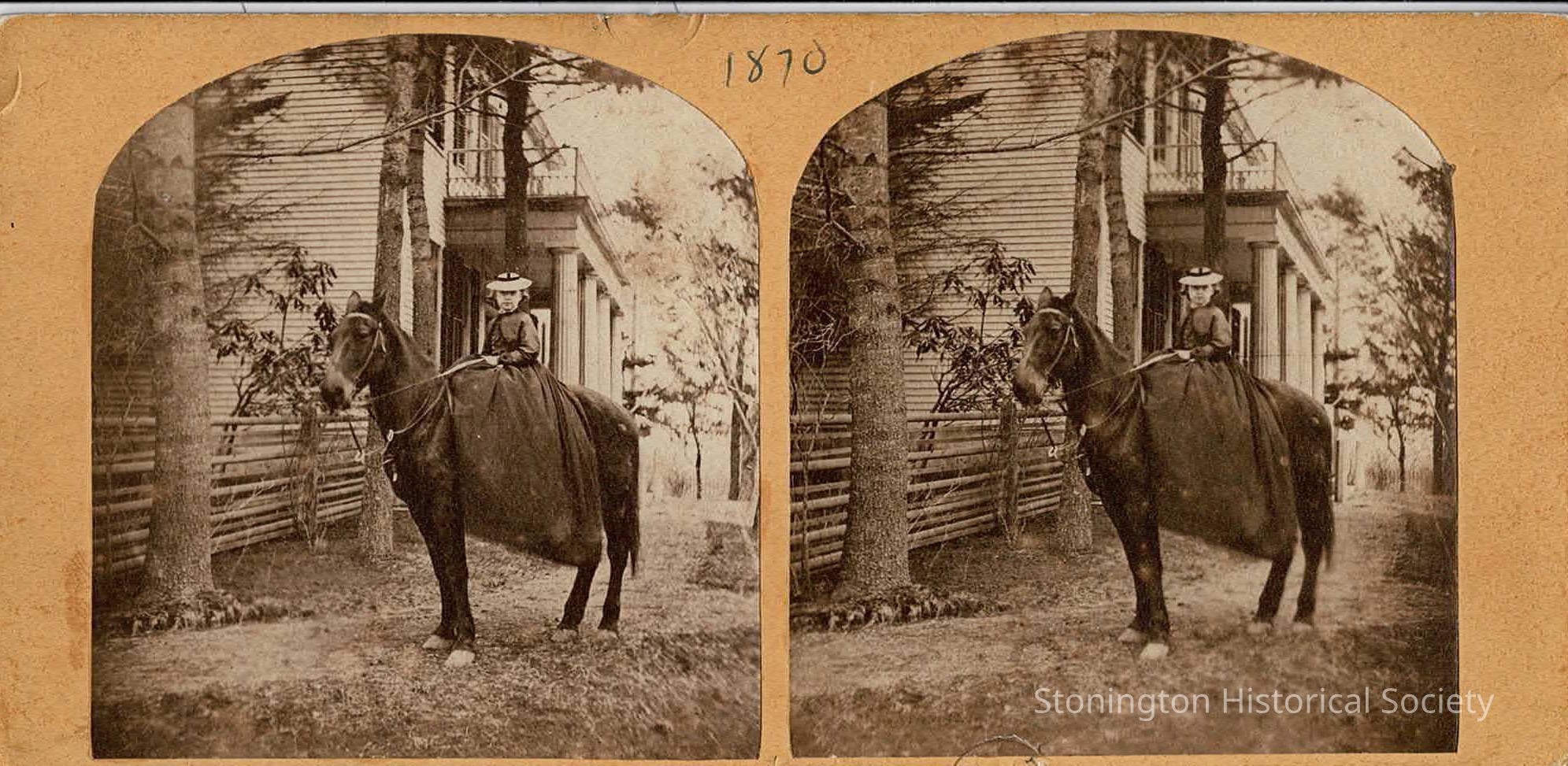 A stereograph showing a little girl in a black dress and light colored hat, sitting atop a dark colored horse. She is to the left of the front door of the main house at Stone Acres, and the date 1870 is written across the top. The little girl is not identified, but the reverse of the photograph reads "Ellen's House" in faint pencil. This note is probably referring to Ellen Phelps, making the little girl in this photograph Ellen's daughter Elizabeth T. Edwards (1857-1896).Collection