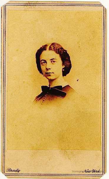 Portrait of young woman with large velvet bow on collar, head only. "Mrs. Amos Biglund, England, 1864"