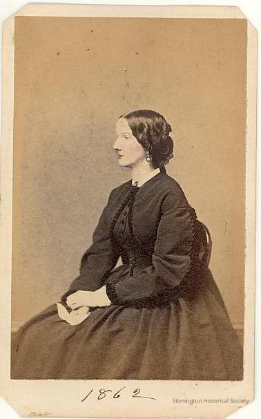 3/4 seated portrait of young woman, "Mrs. John B. Chapron", with tinted lips and cheeks, with cameo pin & matching earrings, dark dress. Dated 1862