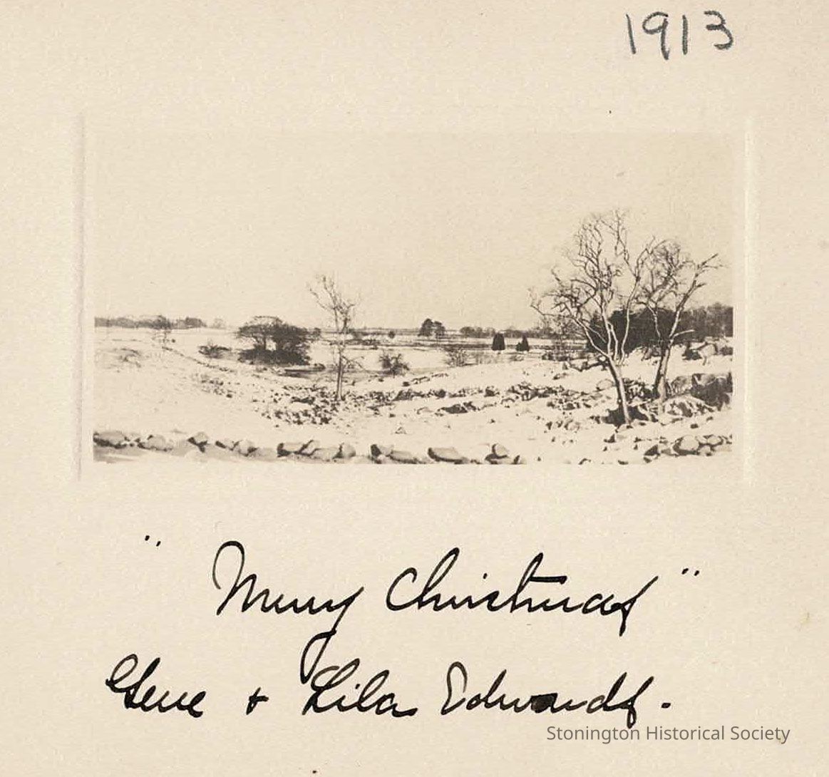 Another photograph turned card. This is a view of a snowy field, probably on the Stone Acres property. The date 1913 is written at the top of the card and below the image it reads "Merry Christmas, Gene and Lila Edwards."Collection
