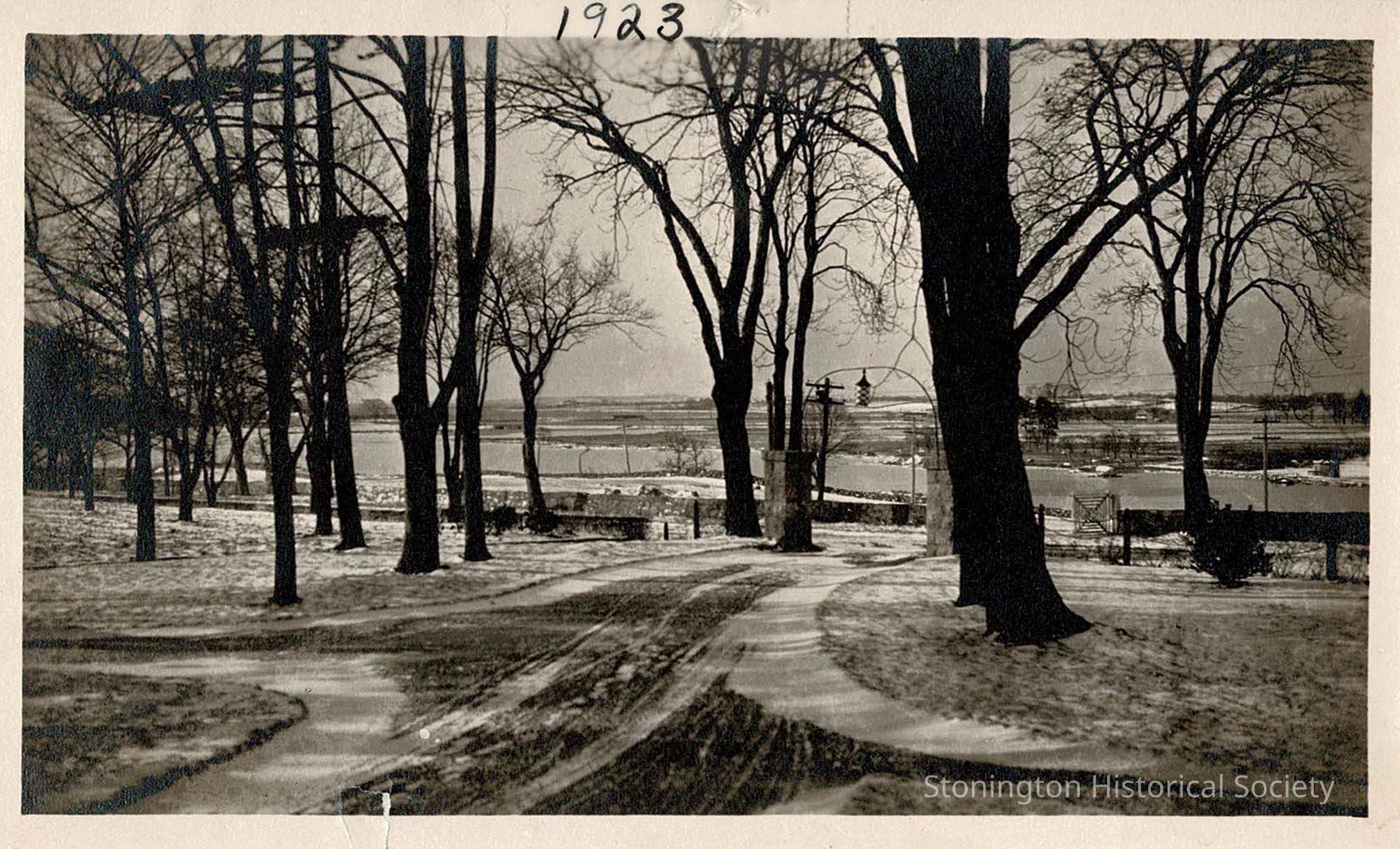 A photograph taken in the driveway of Stone Acres in 1923. This shows North Main Street and the cleared property down to the water.