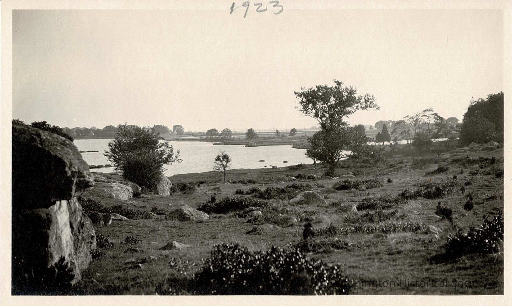 A view of the pasture land surrounding Stone Acres, taken in 1923. A large rock formation is visible in the left foreground, and a large cove, most likely Quanaduck Cove is visible in the background.Collection