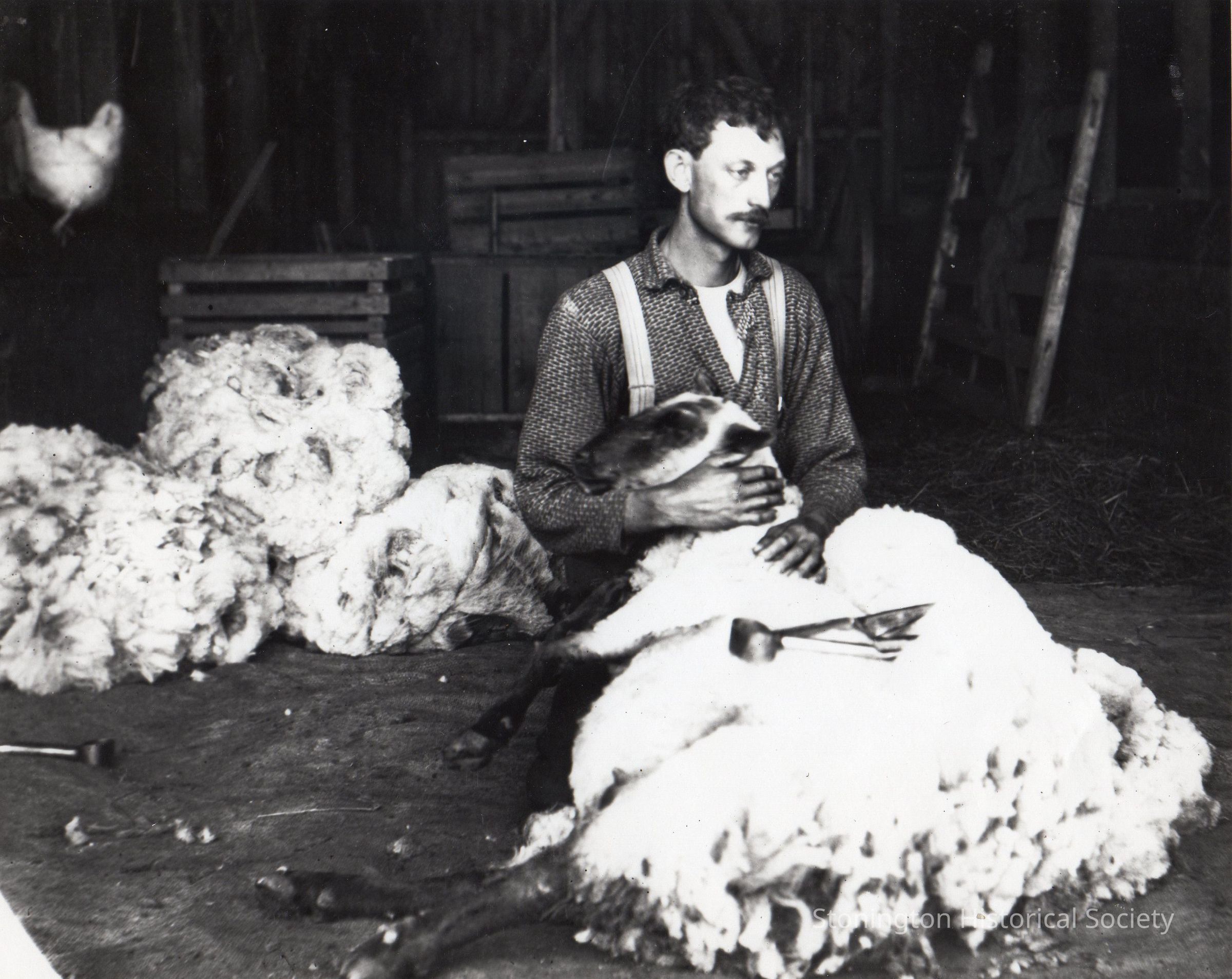 Black and white photograph of farmer shearing sheep, possibly at Stone Acres Farm