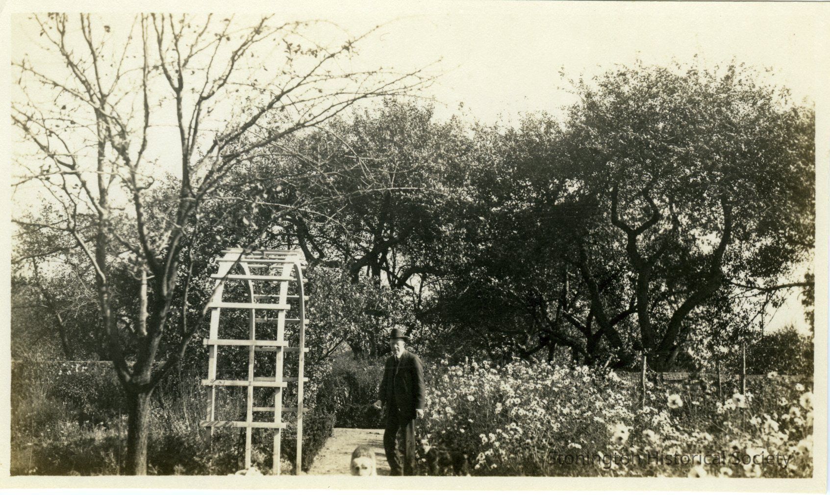 Photograph of a man and dog in the gardens on the Stone Acres property (close to the greenhouse).